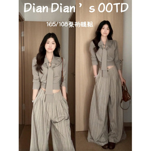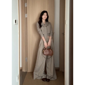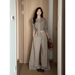 秋季新款慵懒感条纹长袖衬衫上衣女宽松显瘦休闲长裤套装