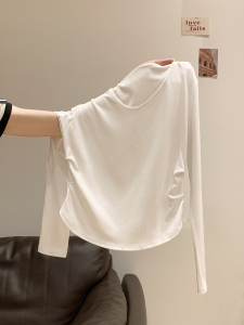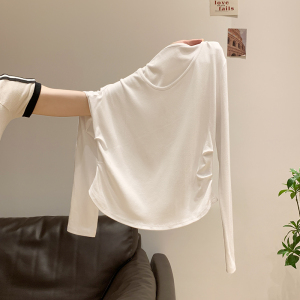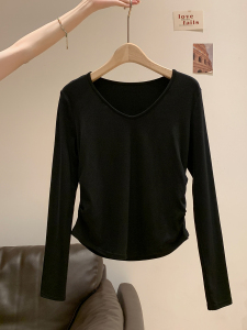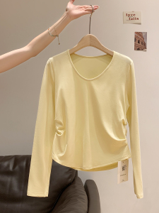 秋装韩系穿搭U领打底衫长袖女正肩t恤褶皱内搭显瘦黄色甜辣小上衣