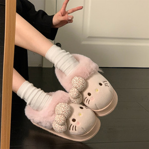 网红高颜值爆款卡通蝴蝶结毛毛拖鞋2025秋冬季新款厚底百搭棉拖鞋