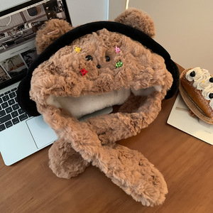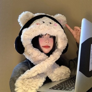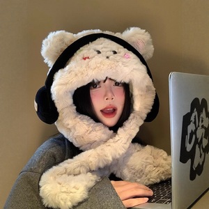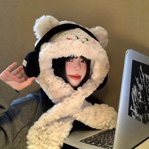 可爱耳机小熊帽子围巾一体两件套女秋冬季加厚保暖毛绒护耳帽帽
