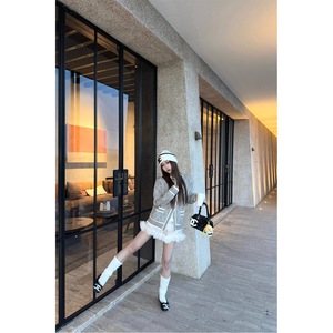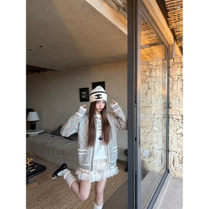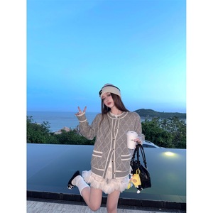 实拍 韩系设计感菱格毛衣外套女装2025秋冬宽松休闲灰色针织开衫
