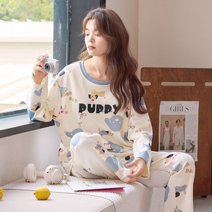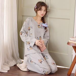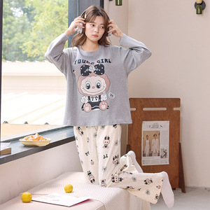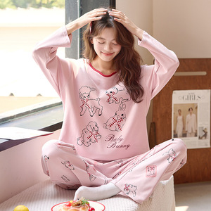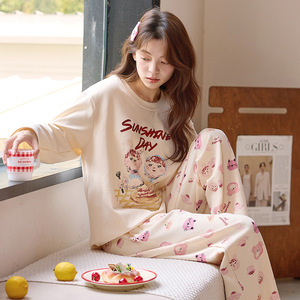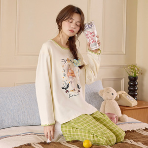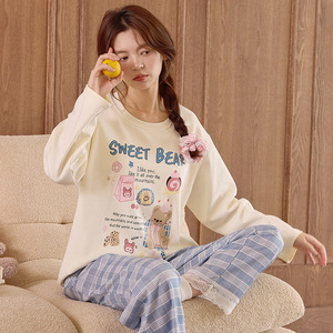 带胸垫睡衣女秋季套头长袖长裤甜美少女格子卡通可外穿秋冬家居服
