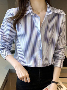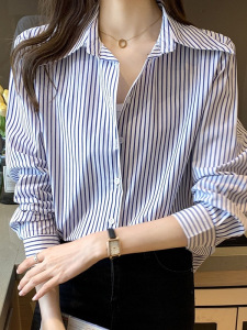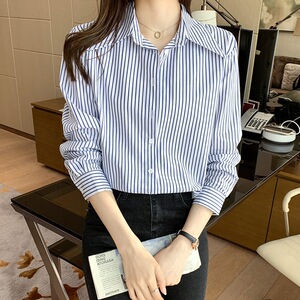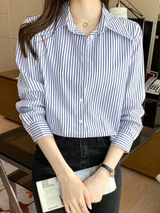 哥家商场同款女装2025秋季蓝白竖条纹衬衫宽松休闲衬衣叠穿上衣