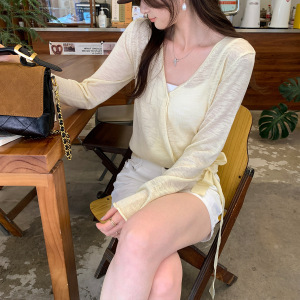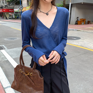 轻熟交叉V领绑带蓝色长袖针织衫女装2025早秋新款慵懒风穿搭上衣