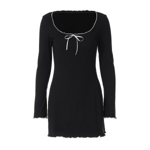 跨境欧美风女装2025秋季新品U字领撞色木耳边收腰显瘦连衣裙