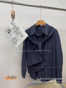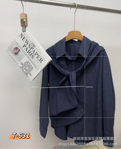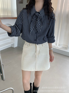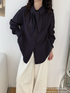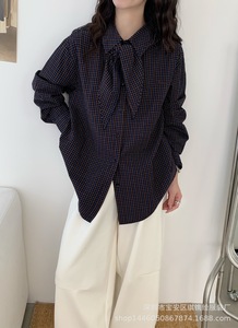 琪镌绘制秋季款穿搭复古女装显白格子衬衫设计感飘带叠穿衬衣631