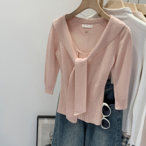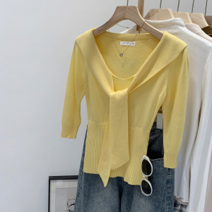 V领黄色五分袖羊毛针织衫女装好物早秋2025新款韩系修身内搭上衣