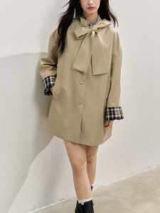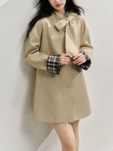 2025"秋日序曲"卡其格纹拼接复古蝴蝶结风衣外套