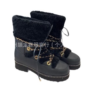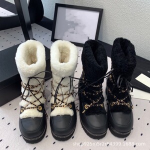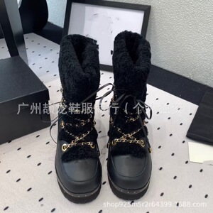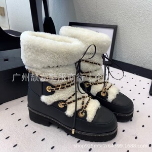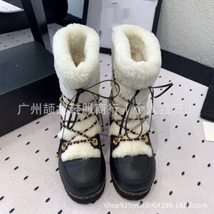 2025新款小香风羊羔毛雪地靴羊皮毛一体绑带粗跟中筒毛毛靴马丁靴
