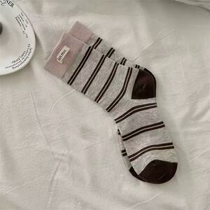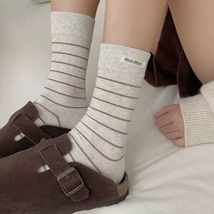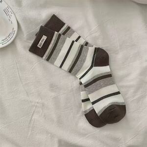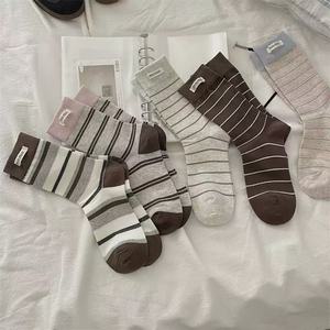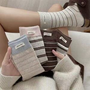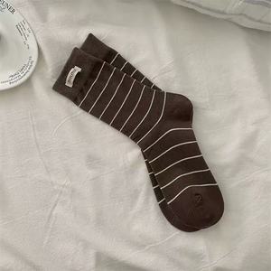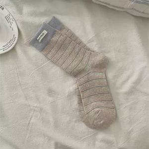 袜子女秋冬新款韩版条纹中筒袜罗口miu 系布标复古堆堆袜百搭女袜