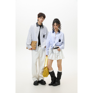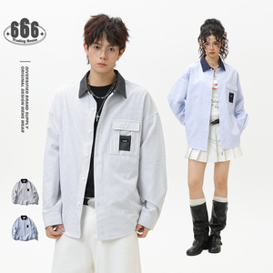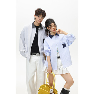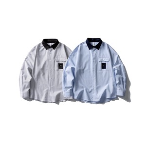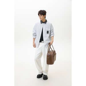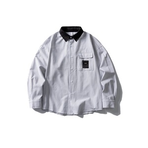 AXIS春秋季日系复古设计感撞色拼接翻领条纹衬衫男士长袖衬衣7089