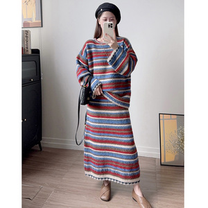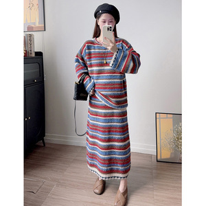 秋冬高级感撞色条纹圆领套头毛衣女套装高腰显瘦针织半身裙两件套