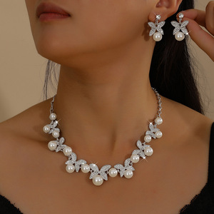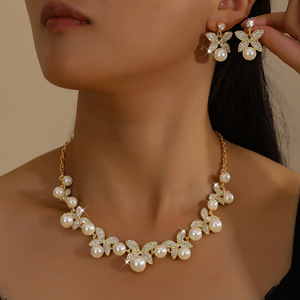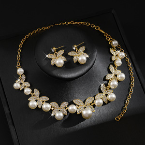 高级轻奢蝴蝶镶钻珍珠项链耳环套装气质感锁骨链百搭宫廷风饰品女