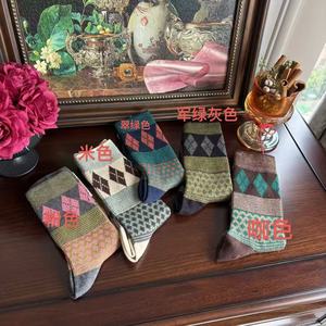 复古简约双针双路英伦风时尚春秋冬菱形格咖色针织袜堆堆袜