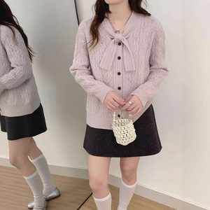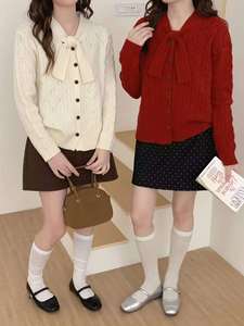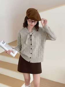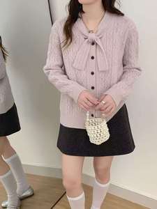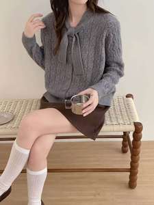 蝴蝶结飘带圆领针织毛衣春秋装女款法式休闲百搭针织衫麻花长袖潮