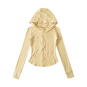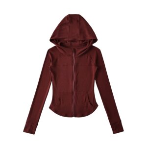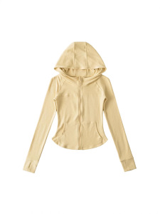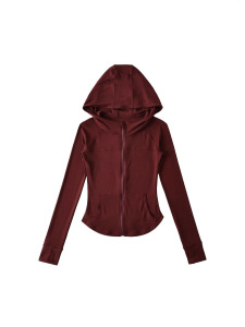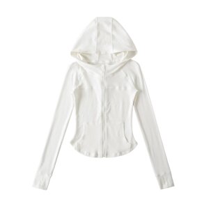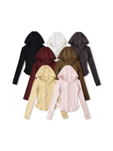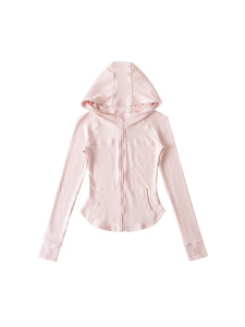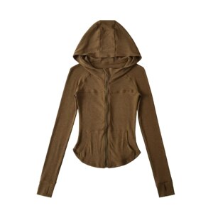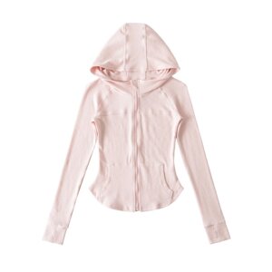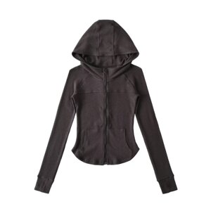 2025早秋款辣妹收腰修身连帽开衫卫衣女纯色百搭帽衫弧边长袖T恤