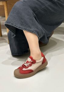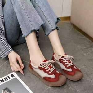 龍林2025秋季新款真皮复古拼色两穿德训鞋厚底女鞋红色运动休闲鞋