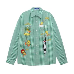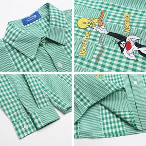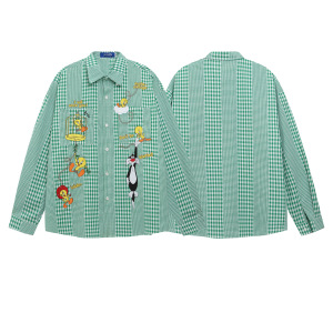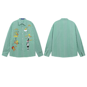 美式复古趣味卡通刺绣格子长袖衬衫男女2025秋季宽松百搭情侣衬衣