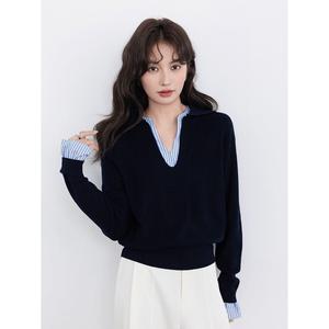 假两件撞色拼接条纹针织衫女大码早夏新款设计感宽松V领长袖上衣