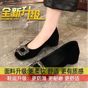 浅口法式水钻气质方头软底通勤妈妈鞋2025秋季新款百搭粗跟单鞋女