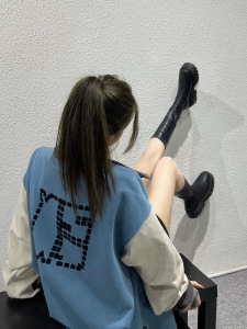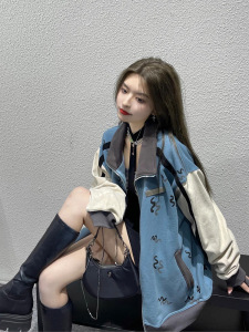 蓝色麂皮外套女早秋新款oversize美式男款宽松立领棒球服夹克