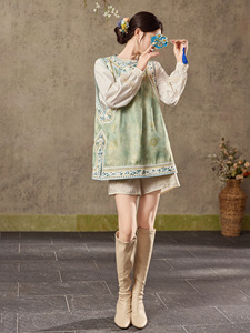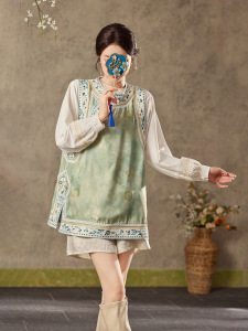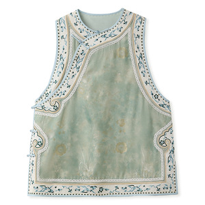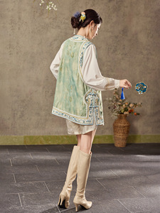秋季复古精致古典盘扣无袖背心女新中式斜襟绣花中长款马甲 N8013