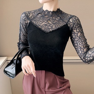 东南亚2025秋长袖半高领蕾丝拼接手工钉珠t恤女时尚修身打底衫潮
