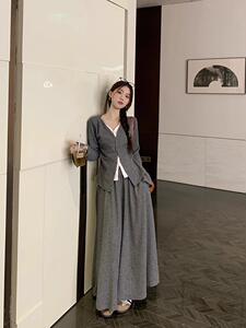假两件撞色拼接V领长袖针织衫显瘦高腰长裙半身裙女早秋时尚套装