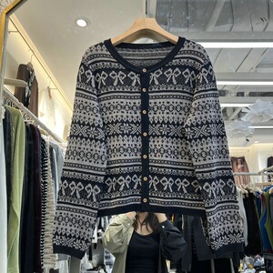 欧洲站2025秋季新款欧货女时尚圆领蝴蝶结提花针织开衫显瘦外套潮