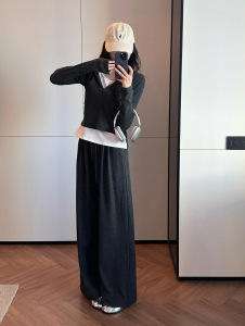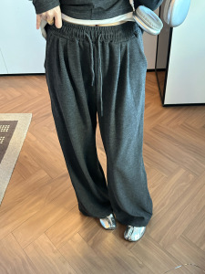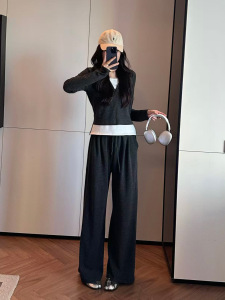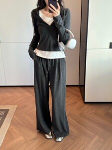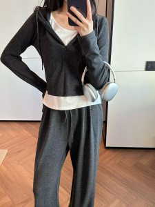 实拍 休闲一整套宽松假两件连帽T恤衫上衣秋冬套装松紧高腰阔腿裤