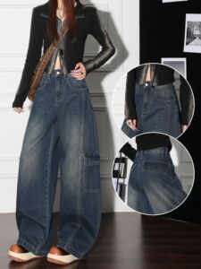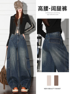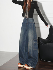 拼接大口袋牛仔裤女春秋宽松阔腿裤工装裤休闲复古设计感拖地裤子