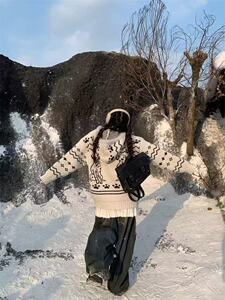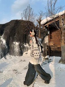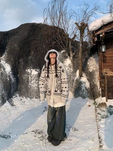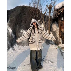 蕾朵美式复古斑点狗提花连帽毛衣外套女秋冬新款设计感拉链针织衫