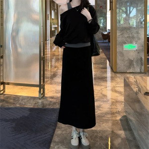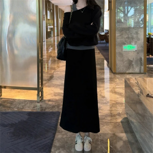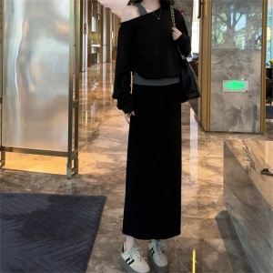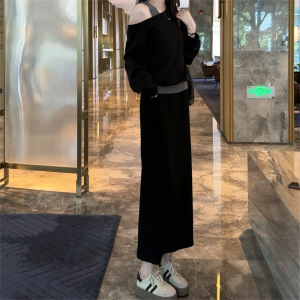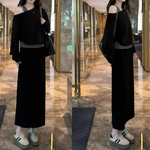 2025年秋季新款假两件漏肩斜肩卫衣+高腰显瘦半身裙两件套套装