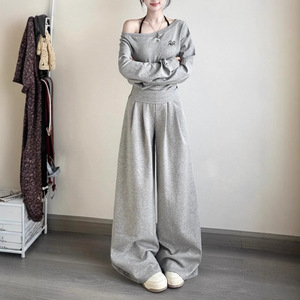 韩系春秋2025新款运动休闲一字领短款收腰斜肩上衣阔腿裤套装女