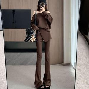高品质版法式时尚套装女秋季宽简约松慵懒一直肩修身显瘦微喇裤
