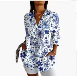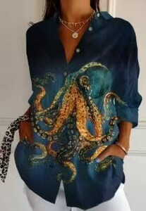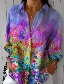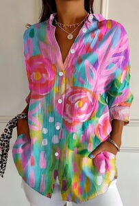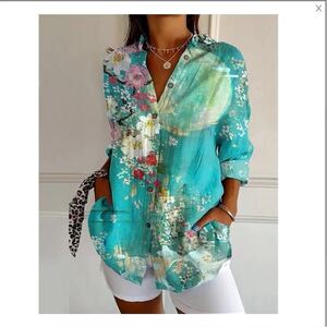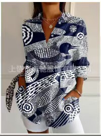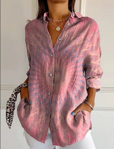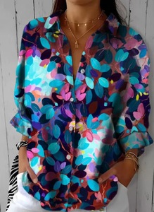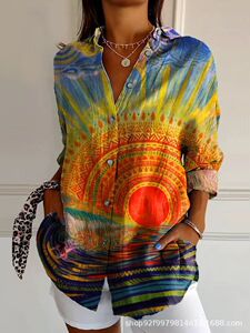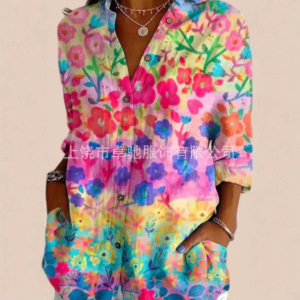 2025欧美亚马逊速卖通3D数码印花抽象图案女士长袖带扣麻布衬衫