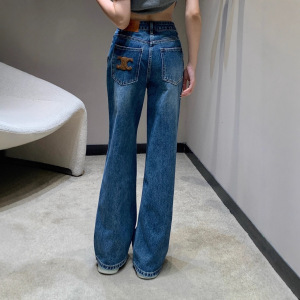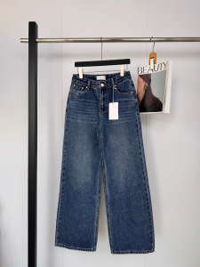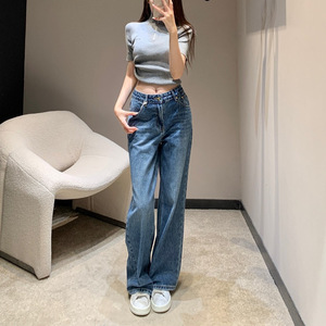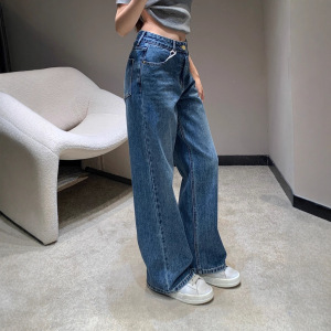 2025秋冬新款凯旋门刺绣水洗丹宁浅色直筒百搭高腰阔腿牛仔长裤女
