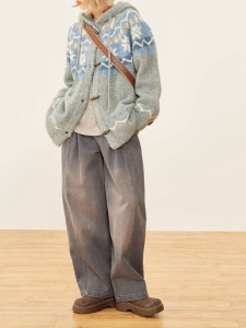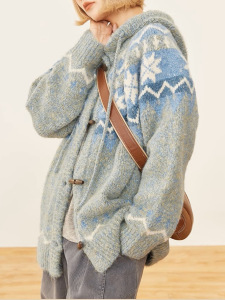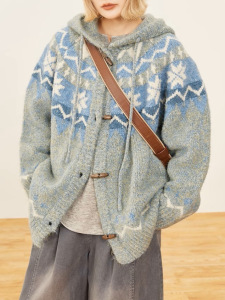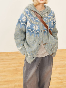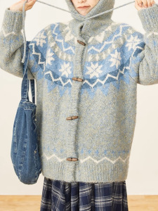 火山马秋冬原木牛角扣含羊毛费尔岛复古毛衣外套连帽开衫