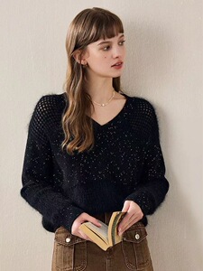 韩系设计感时髦杏色翻领长袖针织衫女早秋气质高级感镂空慵懒上衣