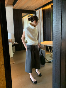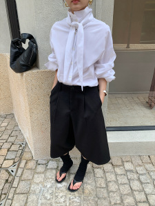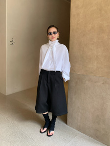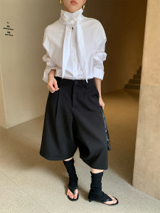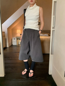 万为 复古西装中裤女2025秋季新款直筒褶皱吊裆休闲五分裤 P3965