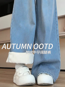 加绒牛仔裤女2025新款秋冬季宽松大码胖mm直筒小个子窄版阔腿裤子