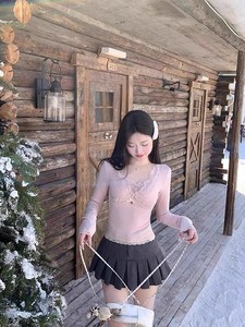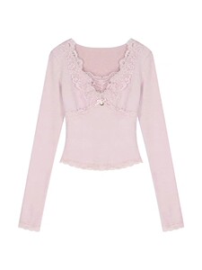 芭蕾风纯欲粉色打底衫女秋冬甜辣妹蕾丝内搭短款T恤独特绝美上衣