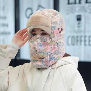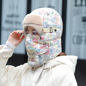 冬季骑车涂鸦雷锋帽女士保暖防寒防风套头帽护耳护脖带护目镜帽子