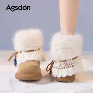 奥古狮登雪地靴女2025新款冬季时尚蕾丝串珠毛毛短靴休闲外穿棉鞋