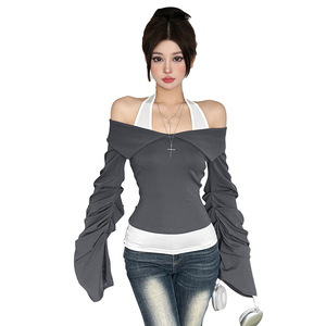 欧美夏季跨境2025新款纯色修身不规则一字领挂脖两件套修身长袖女