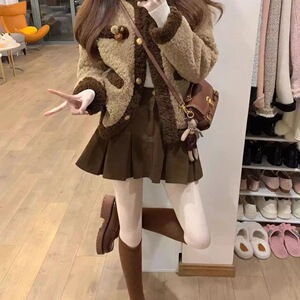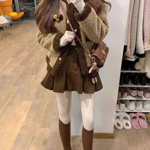 秋冬小个子茶系穿搭小香风羊羔毛外套半身短裙轻熟高级感两件套装