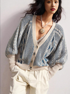 跨境欧美高级撞色深V领灯笼袖宽松优雅贝壳扣针织开衫毛衣代发