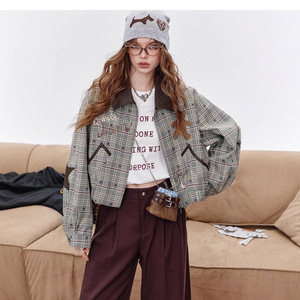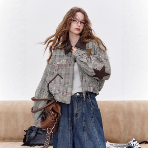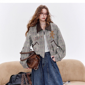 妖精的 爱心格纹PU皮翻领拼接外套女2025年早秋新款设计感夹克