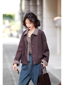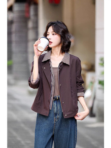 2025设计感条纹衬衫领假两件外套女春秋季新款港风短款时尚夹克潮