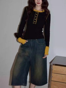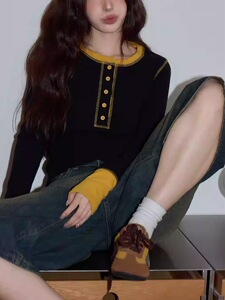 设计感黑色圆领拼接T恤女2025秋高级气质收腰修身长袖上衣